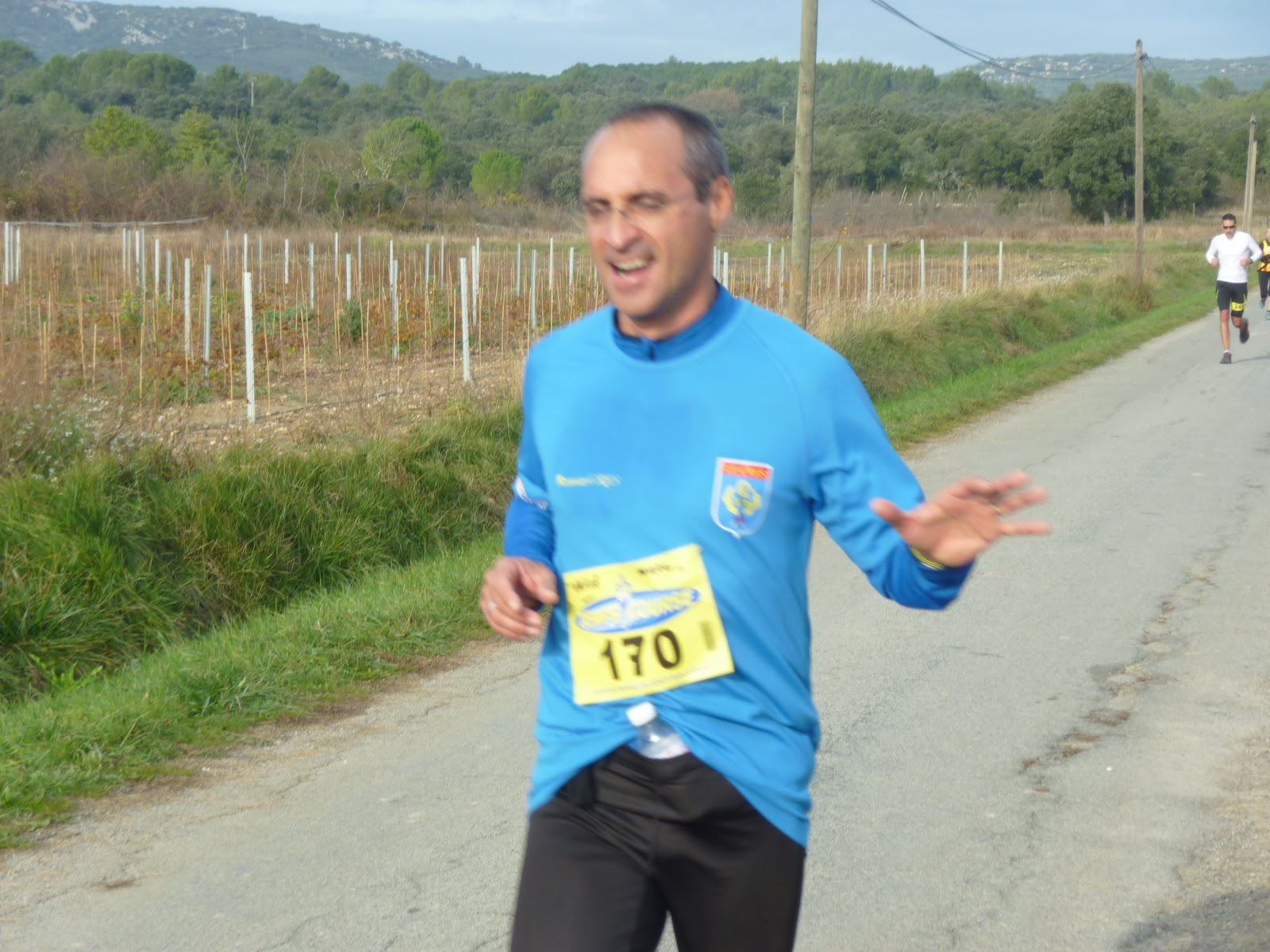 BERTRAND faisait ses débuts sous nos couleurs sur cette course ou rien n’est facile,faux plats,ascencion d’une cote avec un pourcentage frolant les 20% et que peu de coureurs arrivent à grimper en courant,au sommet une vue imprenable au nord sur le Pic St Loup et au sud sur la mer,une descente caillouteuse et sinueuse,et enfin un retour valloné sur ce petit village ou on a l’impression que tous les habitants sont bénévoles.
